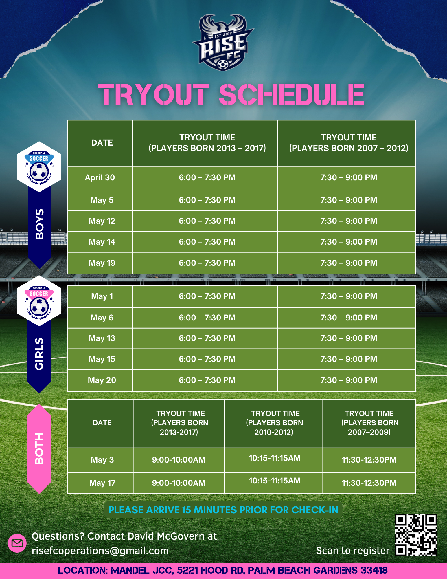 Welcome to the Open tryouts for Rise FC 25/26 season. We are looking forward to seeing all your players at the fields. Please arrive 15 minutes early and bring water and proper soccer attire.